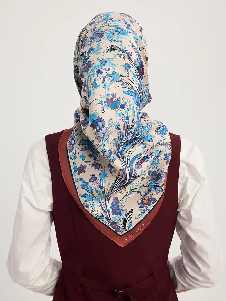 Schaless Serica İndigo Barok Floral Desenli Twill İpek Eşarp