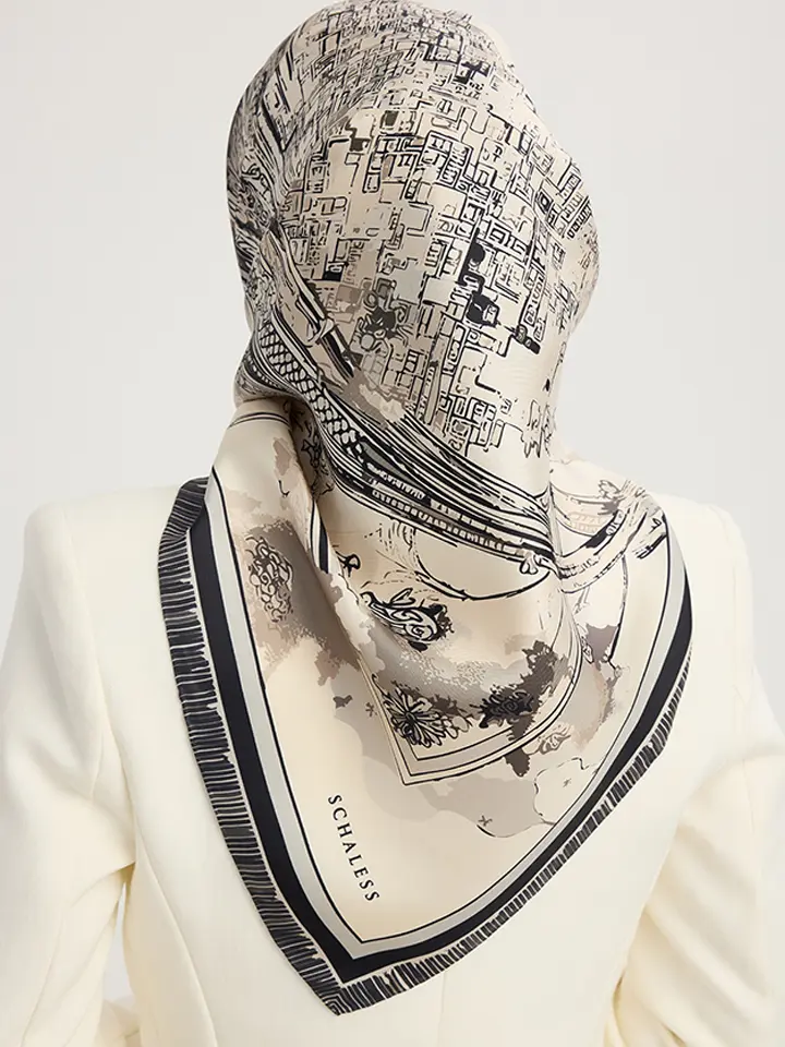 Schaless Serica Siyah Şehir Desenli Twill İpek Eşarp Resmi